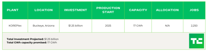 Kore Power previously told TechCrunch that it would produce batteries for energy storage systems and e-mobility products, including cars, trucks, buses, boats and trains. It intends to support OEMs by manufacturing 30D-compliant batteries, so Kore is working closely with domestic partners to line up critical materials suppliers onshore.