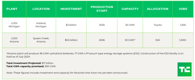 In August 2023, LG announced a building spree in North America, with plans to spend up to $17 billion through 2025 on constructing a total of eight factories (two of which are already operational) with more than 300 GWh capacity. LG has not yet shared details on each plant.