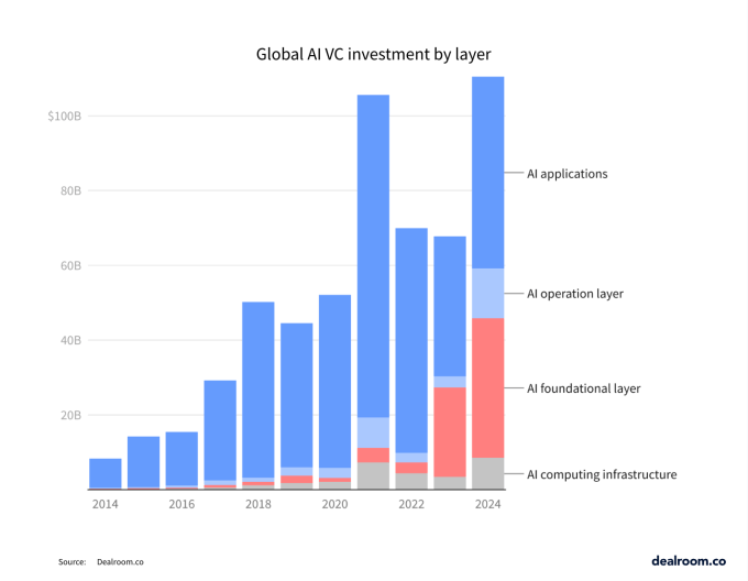 Unsurprisingly, its two biggest business interests, foundational models and generative AI, appear to be the engines driving all VC activity, with generative AI companies raising $47.4 billion in 2024, and foundational AI technology overtaking AI applications with the most growth (and a giant slice of funding) over the last two years.