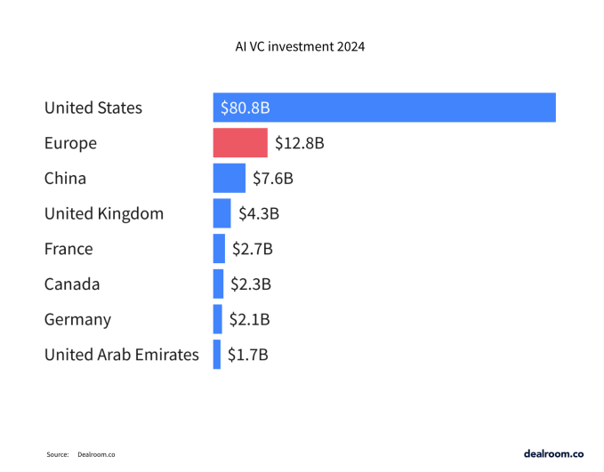 For those who believe AI companies are under-supported outside of that market, Dealroom’s figures lay bare how that works. A full 42% ($80.7 billion) of venture capital raised in the U.S. went to AI startups last year, compared to just 25% ($12.8 billion) in Europe, and 18% across the rest of the world. China was the standout last year with $7.6 billion invested.