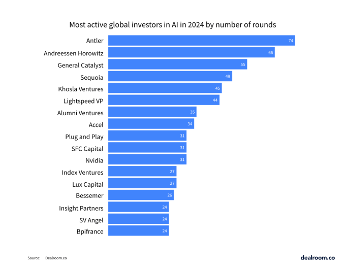 As for VC firms, Dealroom found that Antler made the most investments in the field last year, with a16z, General Catalyst, Sequoia, and Khosla Ventures rounding out the top five.