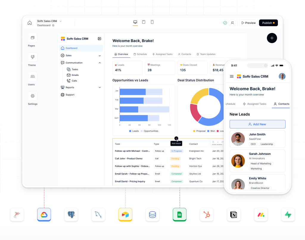 This new data-agnostic strategy comes alongside a new app-building experience. Softr gives you a set of predefined blocks that you can drag and drop to build pages with lists, charts, forms, tables, and the like. There are some new AI features to help you build your app, too.