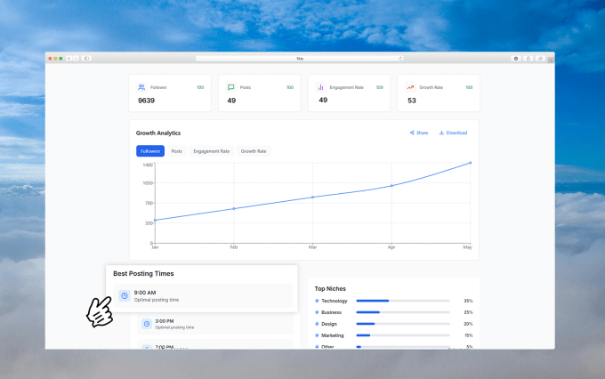 Tracking your Bluesky performance is another key aspect of the service, as BlueSkyHunter offers a variety of metrics and charts in its dashboard, including those for tracking total follower count, posts per month, engagement rates, growth rates, best posting times, top niches (categories), topic engagement, and more. These can be filtered for the past day, week, month, three months, or all time.
