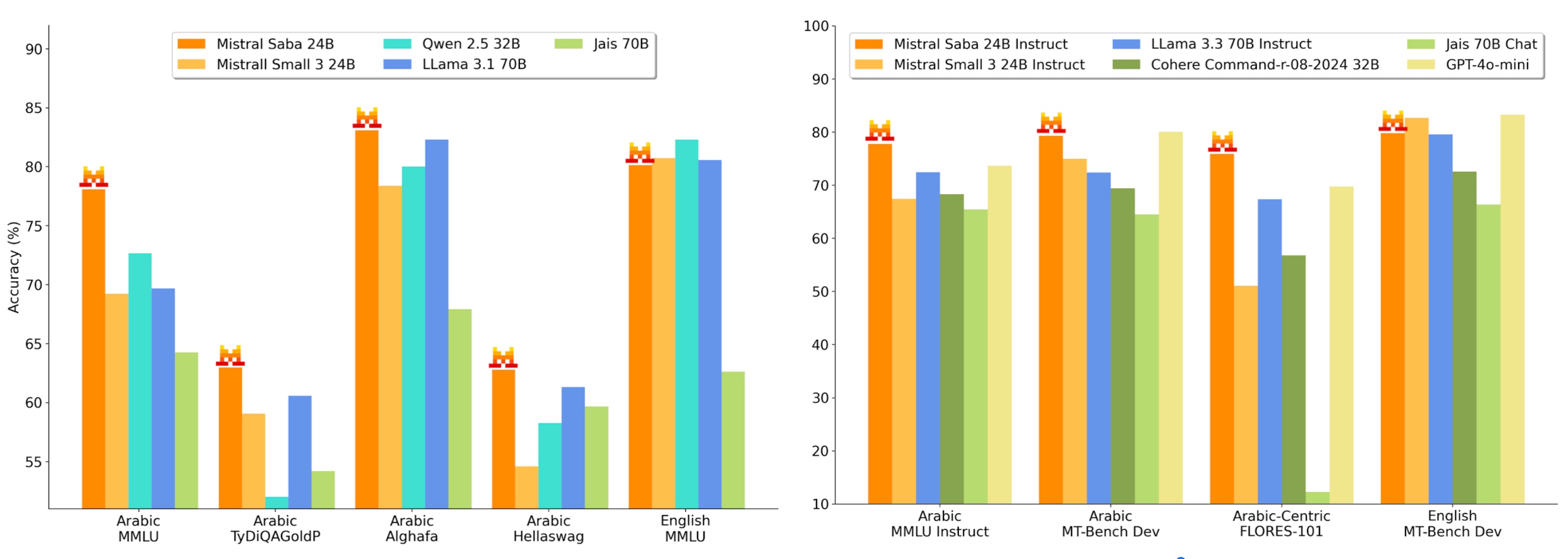 Mistral Saba is comparable in size to Mistral Small 3, its general-purpose small model. But, according to Mistral’s own tests, Mistral Saba performs much better than Mistral Small 3 when handling Arabic content.