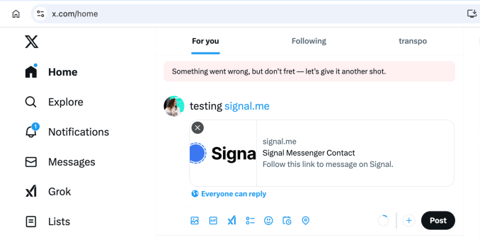 TechCrunch has attempted to share a link via post and DM. When trying to share via a post, a message pops up that says: “Something went wrong, but don’t fret — let’s give it another shot.”