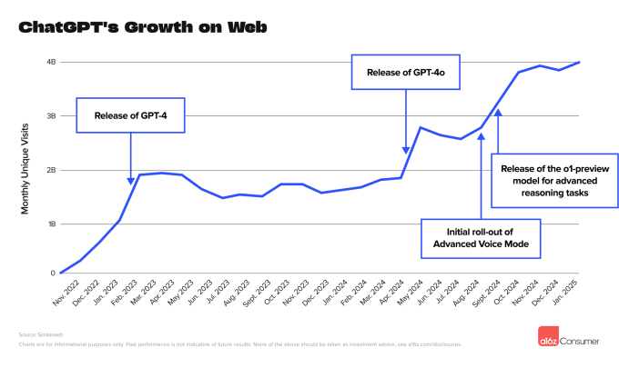 According to a16z, initial consumer demand for ChatGPT was driven more by novelty. That is, consumers were interested in trying the app but weren’t necessarily sure how it would fit into their everyday lives.