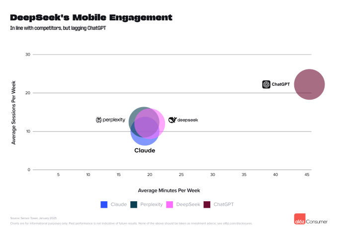 On mobile, DeepSeek users are even slightly more engaged than Perplexity and Claude users, according to data from mobile intelligence provider Sensor Tower. However, it still lags behind ChatGPT on this front.