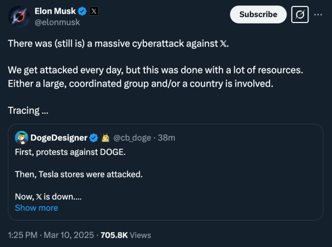 “There was (still is) a massive cyberattack against 𝕏. We get attacked every day, but this was done with a lot of resources. Either a large, coordinated group and/or a country is involved. Tracing …” he wrote on X.