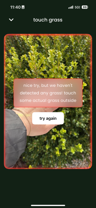 Don’t even try cheating; using a computer vision AI, the app can distinguish between house plants and actual outdoor grass. So, after the app rejected a photo of my Monstera plant, I went outside and found the nearest green thing: a bush. I would argue that a bush is grass-adjacent, but the Touch Grass app is hellbent on making you touch actual grass, so the bush was not sufficient.