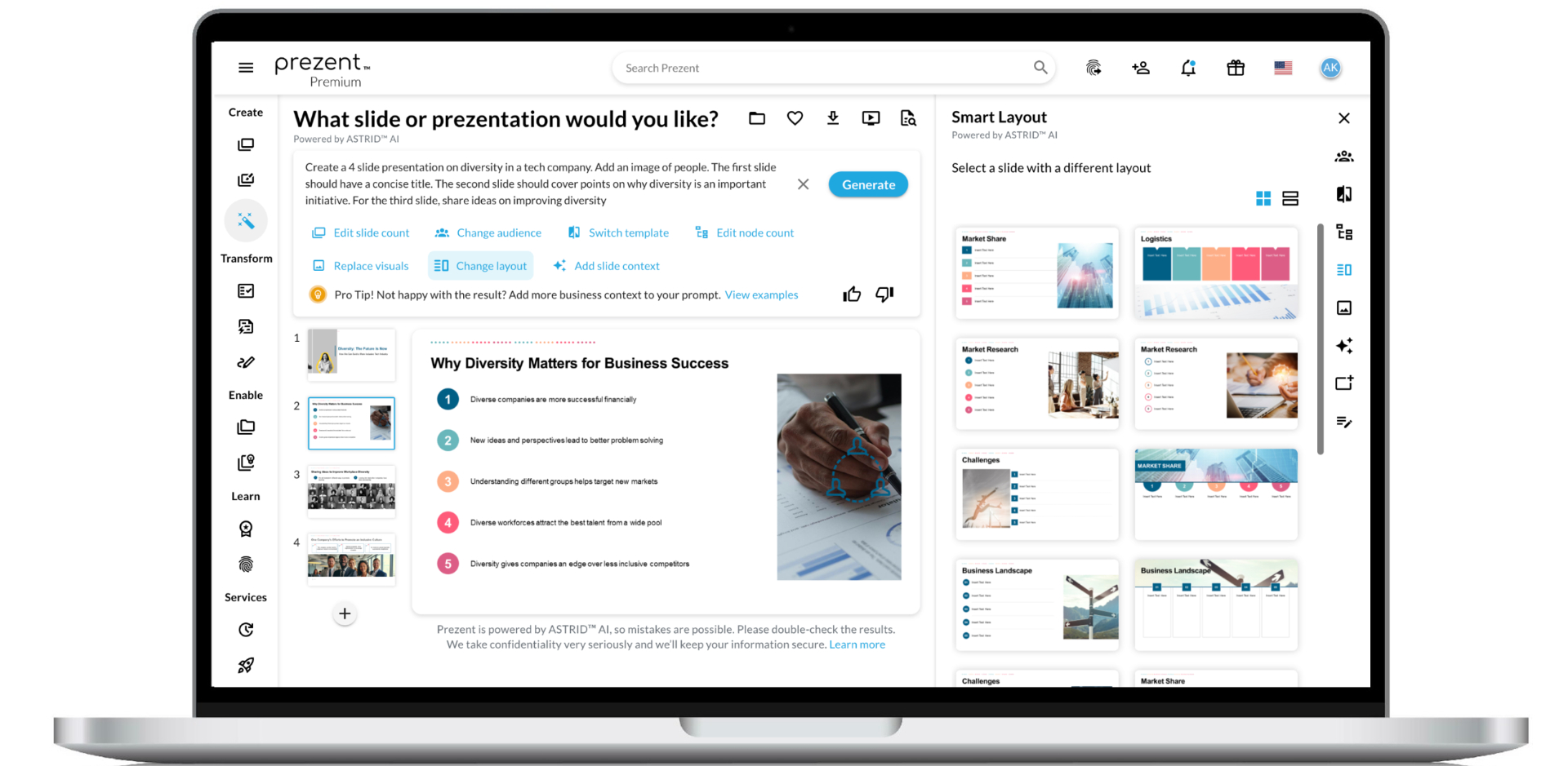 Prezent uses openly available AI models fine-tuned on proprietary data, including a dataset of 2 million slide decks, to power its platform, Mishra says. The startup also builds AI models for specific applications, like recommending layouts users should use for particular decks.