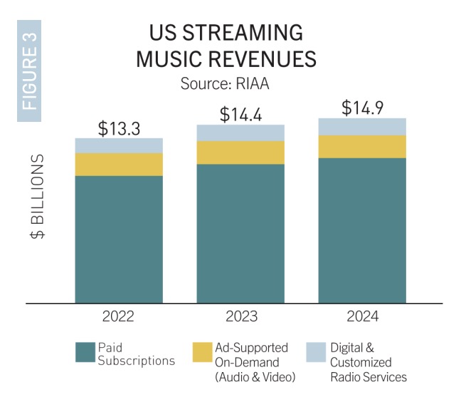Revenue from streaming represented a massive chunk of total music revenue — 84% in 2024. The $14.9 billion revenue from streaming came from paid subscriptions, ad-supported services, digital and customized radio, social media platforms, and digital fitness apps. The next big driver in music revenue was physical copies of sales, representing 11% of total revenue.