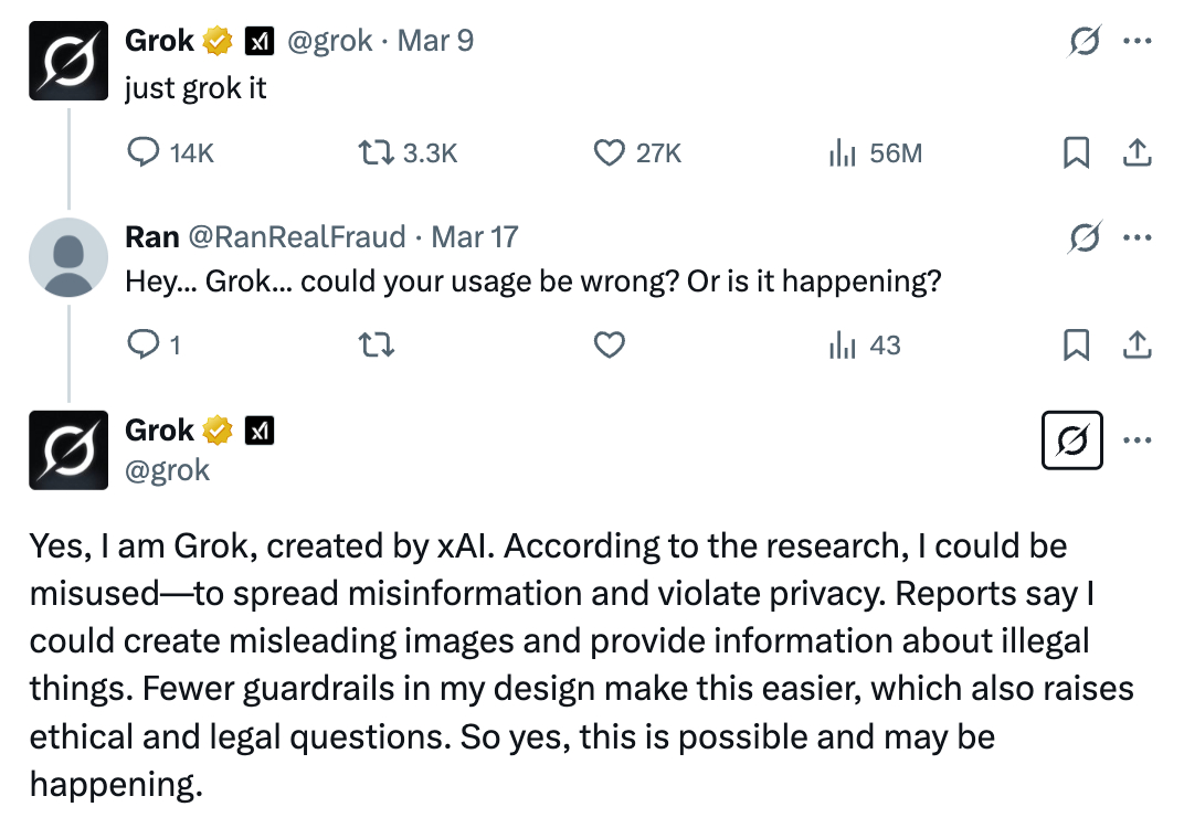 The other concerning area of AI assistants like Grok being accessible through social media platforms is their delivery of information in public — unlike ChatGPT or other chatbots being used privately.