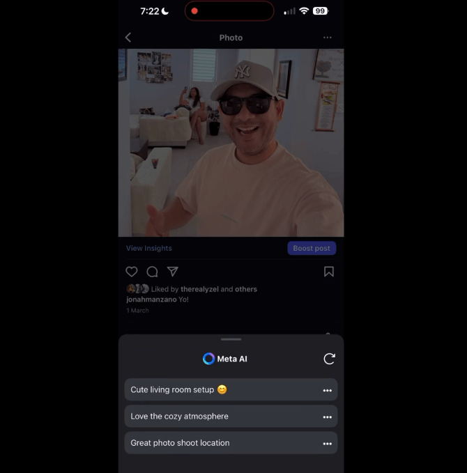 Users who have access to the test feature will see a pencil icon next to the text bar under a post that they can tap to start accessing Meta AI, according to a video posted by Manzano. From there, Meta AI will analyze the photo before generating three suggestions for comments.