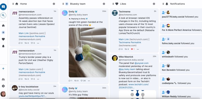 Another TweetDeck-style web app, Deck.blue lets you fill your screen with columns featuring your Home feed, Notifications, custom feeds, lists, and more. The app also supports multiple accounts and the scheduling of posts.