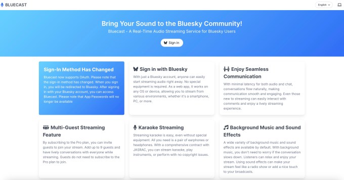 Bluecast’s real-time audio streaming service for Bluesky users lets anyone start streaming without special equipment. The service’s web app works across platforms, including mobile and desktop, and includes features like multi-guest streaming, streaming karaoke, background music and sound effects, visual effects, and other advanced features.