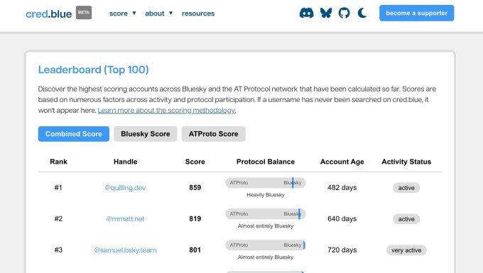 Cred.blue’s service gives you an easy way to generate a “score” based on a user’s identity in the ATProto ecosystem. While in some ways the idea of scoring someone’s social activity makes this sound like a Klout for the open social web, Cred.blue’s goal is to help users understand more about the people they follow and whether their account is healthy and active. The scoring takes into account a user’s public data, like their posts’ content, likes, social graph, and more, as well as their involvement with the larger ATProto ecosystem. Users can also see where they rank on a Leaderboard that spans Bluesky at the AT Protocol network.