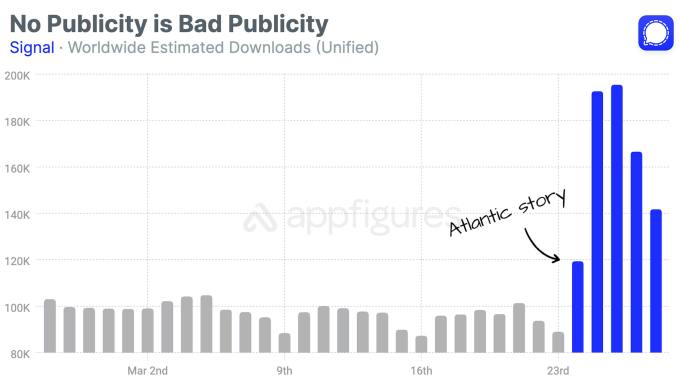 Appfigures chalks up the doubling of downloads to the old adage “all press is good press,” as the scandal increased Signal’s visibility and likely introduced the app to thousands of users for the first time.