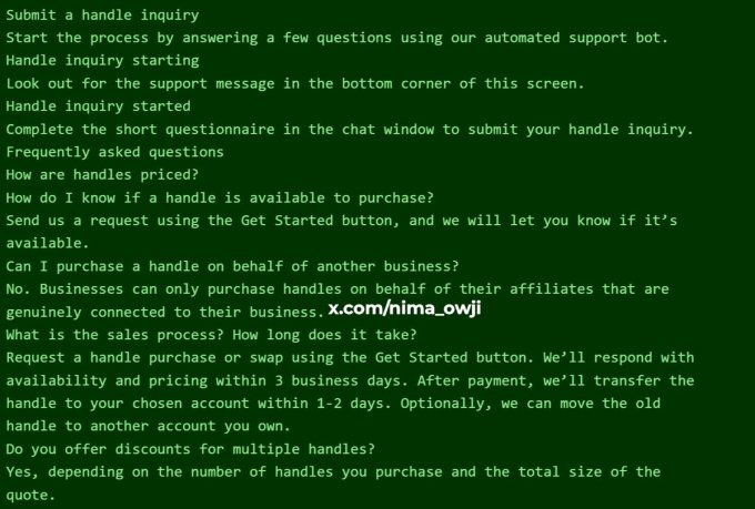 So far, the FAQ details the answers to a handful of common questions X users may have about the process, including how to start a handle inquiry, what the sales process is like, and how the transfer will work.