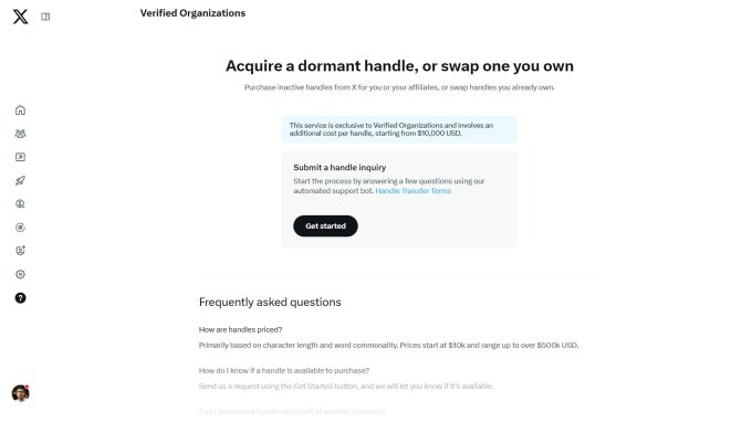 X’s plan to boost revenue by selling off dormant usernames on its service is starting to shape up. According to recent changes found in X’s web application, the company is setting up a “handle inquiry” process that will allow Verified Organizations — companies and other organizations that already have a $1,000 per month X subscription — to bid on abandoned X handles. Those bids will start at $10,000 and may range to over $500,000, according to an FAQ discovered in the web app.