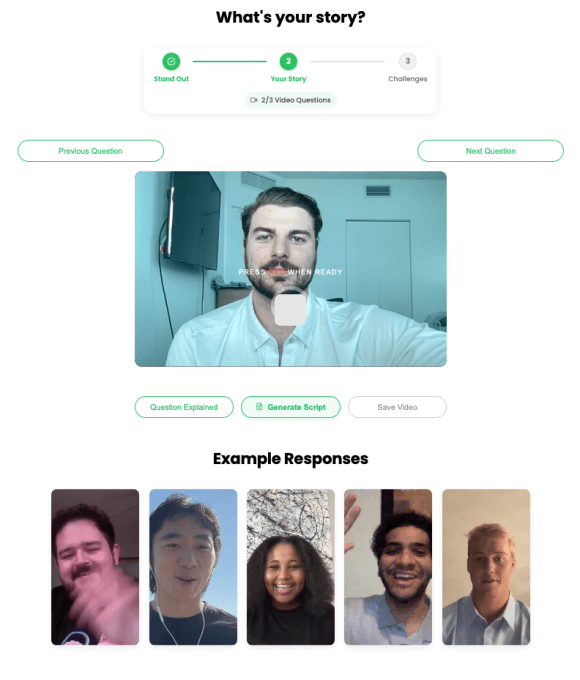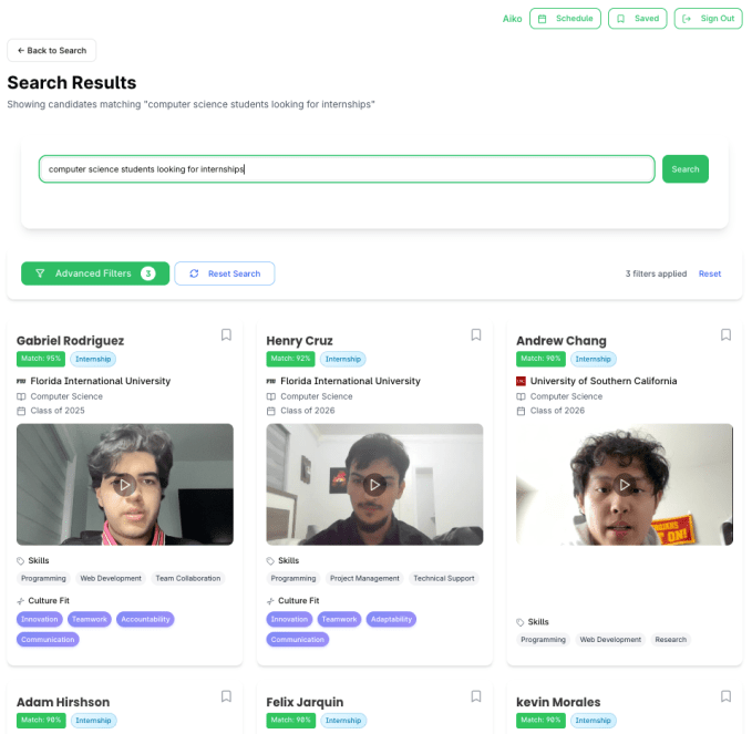 On the employer side, companies can filter through video resumes to find the right candidates for their open roles. They can look for candidates from a specific top school or with specific skills. After that, they will see a bunch of video resumes displayed alongside percentages based on how much their expertise aligns with their company’s culture and requirements for the position.