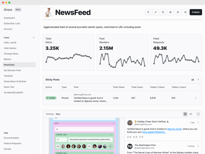 Graze’s software, available via the web, offers tools to build, customize, publish, and manage Bluesky feeds. Unlike on other social networks like X or Meta’s Threads, where users are defaulted into a main algorithmic feed every time they open the app, Bluesky’s growing social network of nearly 35 million users allows anyone to create and follow custom feeds, pin them to the app’s navigation, and make any one of them their preferred home feed.
