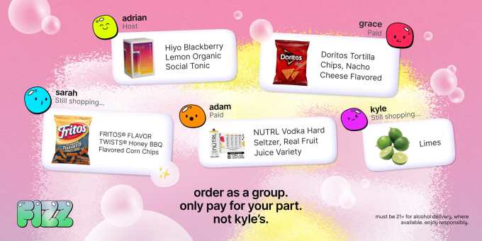 The host of a party can invite guests into their Fizz cart to allow everyone to choose what they want to bring to the gathering. The app aims to eliminate the headache of splitting the bill, so everyone pays for what they add to a cart.