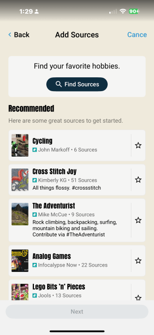 For instance, if you choose to start a “Hobbies” feed, you can tap on that category and then look for sources to add across a number of subtopics, like cycling, gaming, Legos, books, baking, hiking, dancing, guitar, comics, sailing, and much more.