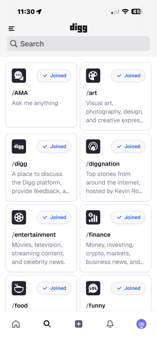 Unlike Reddit, there are only a handful of communities to join for the time being, including those focused on interests like art, entertainment, sports, finance, food, music, science, and technology, as well as those for asking questions (AMA), tracking news, or chatting about Digg itself. (The company says the ability to create communities will roll out in later tests.)