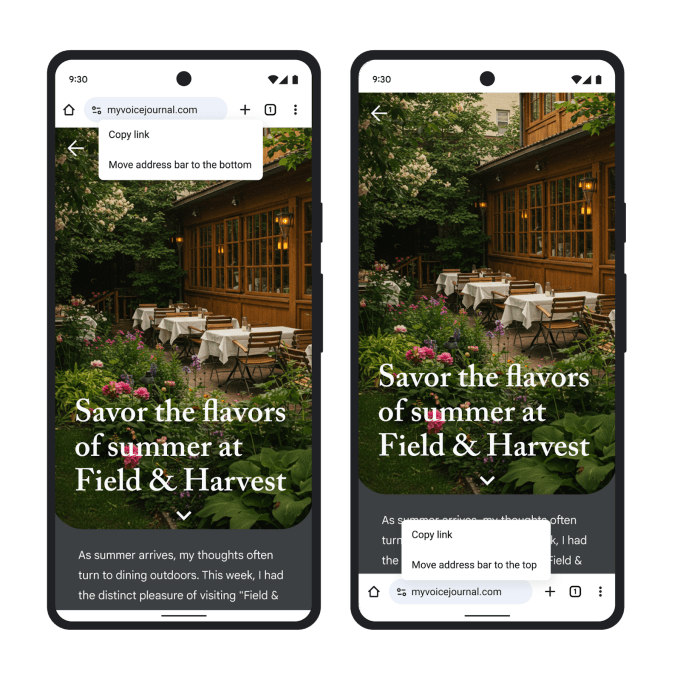 Having learned from Apple’s prior challenges, Google is not forcing the change on all its users, however. Instead, it’s adding a new feature that lets users configure the address bar’s location to their liking.