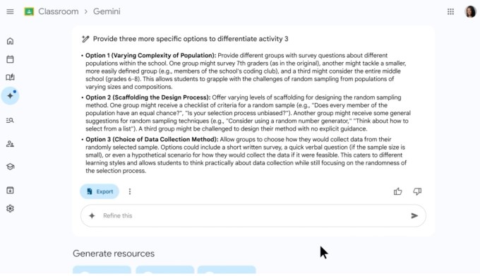 This is essentially just taking an activity that students are already doing — asking an AI chatbot to explain a topic or answer questions — and redirecting that activity back to Google’s own AI technology, where it’s specifically been trained on the teacher’s own classroom materials.