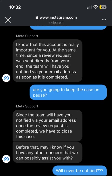 “I opened around 5-6 tickets on my Verified account. The agents were dismissive and even closed the chat,” one Meta user, Manya Khurana, told TechCrunch. “I have had the account since 2017 and never had an issue. They suspended me, saying I did not follow community guidelines, which is false. I had almost 12,000 followers and was going to launch my small business on it to have income, but I have not been able to start it. My career has been affected. … This has been heartbreaking.”