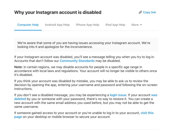 To date, Meta has only publicly acknowledged the ban affecting Facebook Groups, saying last week that it was fixing the “technical error” that led to the suspensions. On an Instagram help page, there’s also a brief mention of people having trouble accessing accounts. However, this language has been in place on the page since March, the Internet Archive indicates.