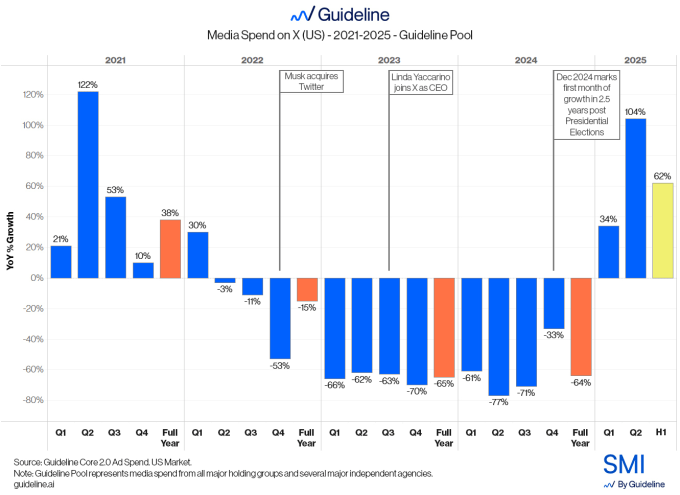 In the U.S., ad spending was up 62% year-over-year in the first half of 2025, Guideline notes. In addition, Yaccarino previously claimed that 96% of X’s advertisers returned to X as of May 2025.