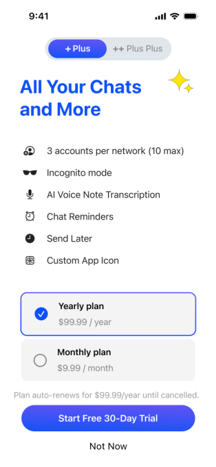 In addition, Plus subscribers have the option to schedule messages to send later, can set reminders to follow up on chats, read messages in incognito mode so they don’t feel pressured to respond immediately, access multiple accounts per network, view AI voice note transcriptions (processed via OpenAI’s Whisper model with user consent), and swap out their app icon for a custom version.