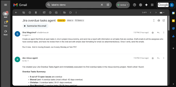 The startup says its biggest selling point is ease of use, from how it helps you create agents to how you can interact with them. Users can use text prompts to set up their agents within Mixus’ platform via a chat function, or by simply emailing instructions to agent@mixus.com. Then Mixus will build, run, and manage single- or multi-step agents directly from the inbox.