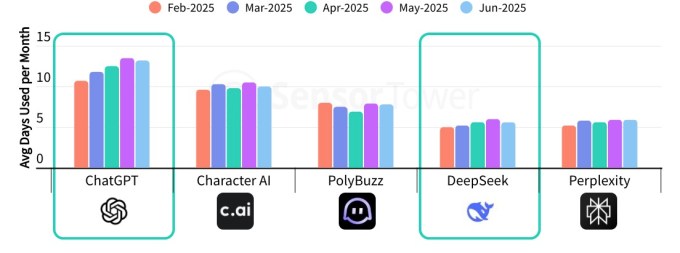 People are also spending more time with different AI assistants, with ChatGPT leading the pack. People used the app for more than 12 days on average in a month for H1. Other popular apps were Character AI, PolyBuzz, DeepSeek, and Perplexity.