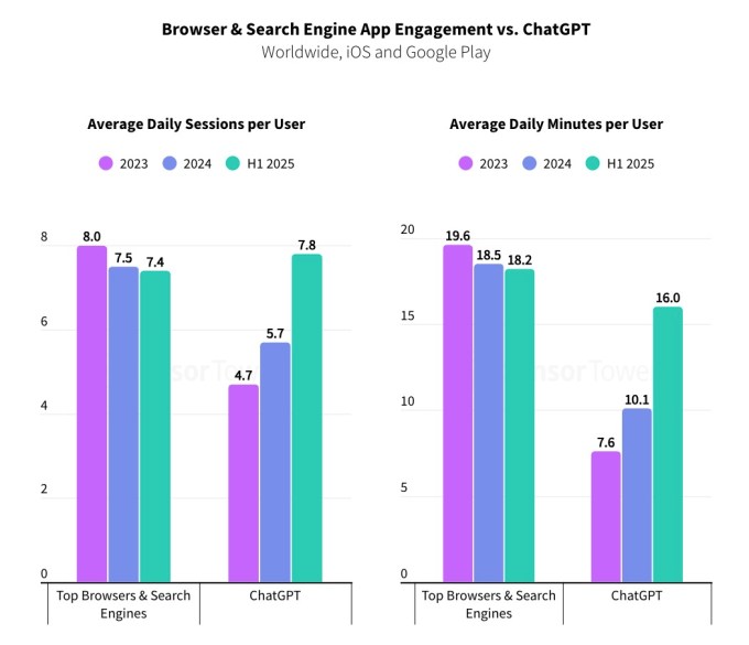 Over time, the gap between usage of ChatGPT and usage of apps in the top search engine and browser categories has decreased. For instance, in H1 2025, ChatGPT had 16 minutes of average daily usage as compared to 18.2 minutes for the top search engine and browser.