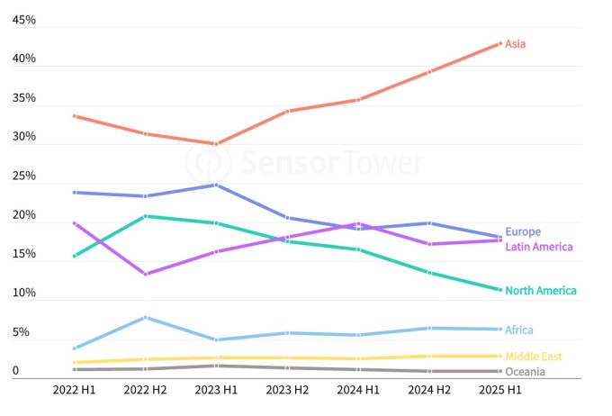 Asia was the fastest-growing market for GenAI apps, and also took the lead for market share in terms of downloads with 42.6%, thanks to markets like India and Mainland China. Download growth in Asia was 80% in H1 2025, as compared to 51% in Europe and 39% in North America.