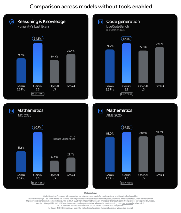 The company says Gemini 2.5 Deep Think achieves state-of-the-art performance on Humanity’s Last Exam (HLE) — a challenging test measuring AI’s ability to answer thousands of crowdsourced questions across math, humanities, and science. Google claims its model scored 34.8% on HLE (without tools), compared to xAI’s Grok 4, which scored 25.4%, and OpenAI’s o3, which scored 20.3%.