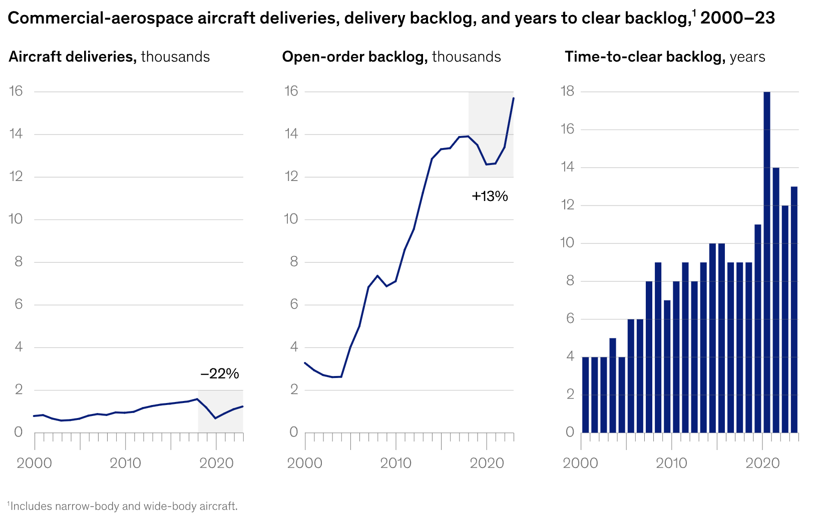 The rebound has spurred airlines to expand fleets, pushing up orders even as the industry grapples with talent and production bottlenecks, as Deloitte notes in a recent report. Tier 1 suppliers are facing extended lead times as the commercial aircraft backlog reaches a record of nearly 15,700 units, according to McKinsey.