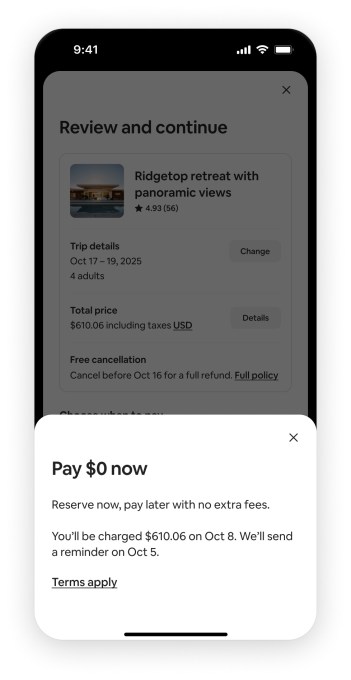 Airbnb has launched a new feature called “Reserve Now, Pay Later” that lets users in the U.S. reserve a property without paying up front, potentially allowing people to cancel their bookings with less hassle if their plans change.