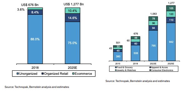 According to analysis by Bernstein Research, food and grocery dominate India’s largely unorganized retail sector. The firm also estimates that online grocery shopping will account for 12% of e-commerce sales by the end of this calendar year.