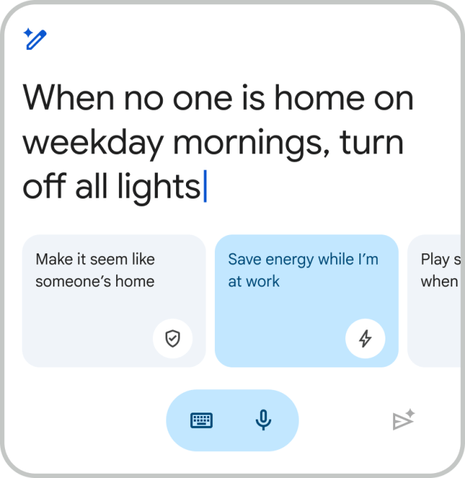And instead of configuring automations manually, you could ask Gemini through a new “Ask Home” feature about what you want to do and get helpful suggestions and assistance. For instance, you could ask how you could feel safer in the home, and it might suggest a home automation setup for when you’re home alone or one that simulates your presence when you’re out of town. If they’re what you wanted, Gemini can set it up.