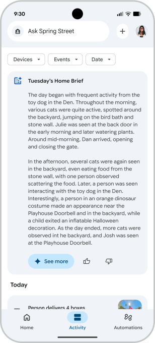 For cameras and doorbells, Gemini can make better sense of what it’s seeing, so that instead of a stream of dozens of notifications, you can get a summary of events or highlights of the events that actually matter.