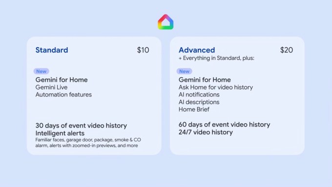 Alongside this release, the existing Nest Aware subscription is being rebranded as Google Home Premium, but the tiers and pricing will stay the same. (Home Premium Standard is $10/mo, and Home Premium Advanced is $20/mo.) Google Home Premium will also be added to Google One subscriptions at no extra cost. That means if you have the Google AI Pro tier ($20/mo.), Google Home Premium Standard will be included for free, while Google AI Ultra users ($250/mo.) will have access to Google Home Premium Advanced.