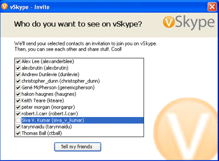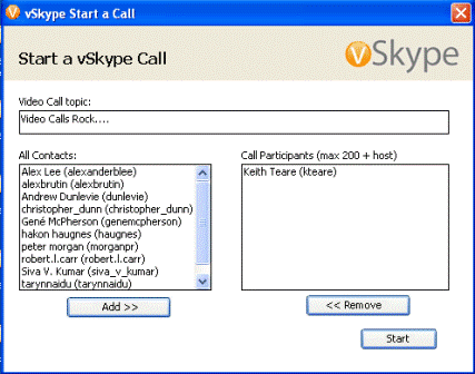 In their own words, “How is vSkype Beta different from other Skype video plug-ins? vSkype Beta provides fast real-time video between you and all of your Skype contacts – up to 2.3 frames per second (fps) for anyone using a standard 56K modem, and up to 24 fps for anyone using DSL, a cable modem, or a corporate broadband connection like a T1 line. vSkype Beta also allows you to share display data. Any open application, or even the entire desktop, can be viewed by other participants during a vSkype Beta call. In addition, vSkype Beta’s “Add to Call” feature allows you invite other Skype contacts to your existing call. This eliminates the disruption of having to create a new call each time you would like to add new callers. With vSkype Beta it is possible for up to 200 people to participate in a single call or meeting without degrading overall performance. All those people can broadcast video at the same time, if they choose, and each participant can view any 8 people at a given time.”