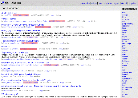 In their own words, “del.icio.us is a social bookmarks manager. It allows you to easily add sites you like to your personal collection of links, to categorize those sites with keywords, and to share your collection not only between your own browsers and machines, but also with others. Once you’ve registered for the service, you add a simple bookmarklet to your browser (see below). When you find a web page you’d like to add to your list, you simply select the del.icio.us bookmarklet, and you’ll be prompted for a information about the page. You can add descriptive terms to group similar links together, modify the title of the page, and add extended notes for yourself or for others. You can access your list of links from any web browser. By default, your links are shown to you in reverse chronological order, with those you’ve added most recently at the top. In addition to viewing by date, you can also view all links in a specific category (you define your own categories as you add the links), or search your links for keywords. What makes del.icio.us a social system is its ability to let you see the links that others have collected, as well as showing you who else has bookmarked a specific site. You can also view the links collected by others, and subscribe to the links of people whose lists you find interesting.”