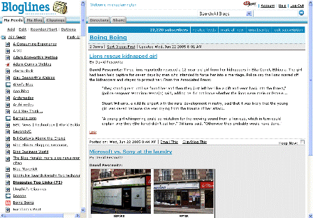 Bloglines has a “two pane” format, with folders and feeds listed on the left (bolded if there are new unread entries), and content from the selected feed shown at the right. If you read content from a lot of sites, this is an excellent way to organize information. It’s also very similar to the interface for most email applications, so its familiar to most people right from the start: