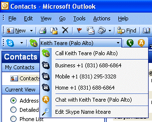 – associate your Outlook contacts with their skype usernames. You can then Skype them directly from Outlook if they are online. If you get an email from them, you’ll see a skype status icon next to their name, and you can chat or talk with them by clicking. Overall, its a nice integration between two of the most important applications on most PC user’s desktops.