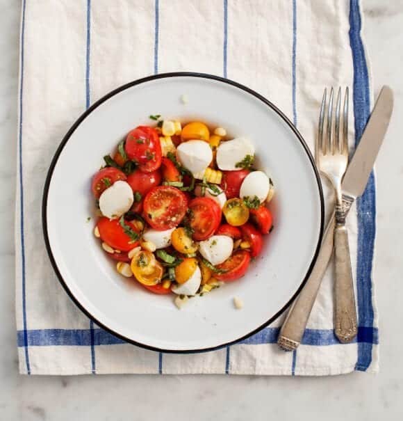 Toss together the cherry tomatoes, mozzarella, corn kernels and remainder of sliced basil with a bit of salt & pepper.